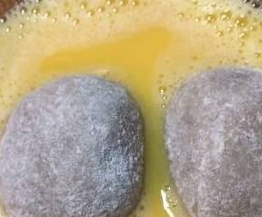 包成小圆球之后,就沾一层面粉,再打一个鸡蛋在碗中,搅拌成鸡蛋液,沾上一层鸡蛋液之后,再沾一层方便面碎。