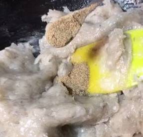 再往里加入适量盐、淀粉、胡椒粉和料酒,搅拌均匀,稍微多搅拌一会,可以揉成团即可。