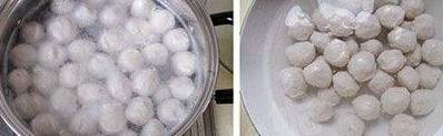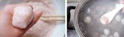 12、右手用勺子挖起鱼肉丸,放到水里。(下鱼丸期间,保持水不要沸腾)
