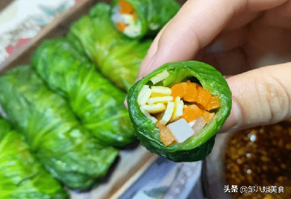 一切处理完毕后,在沙拉中加入一些配料并将其包起来。最后调好酱汁,蘸着吃。