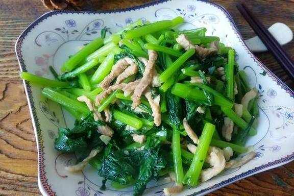 【肉丝炒茼蒿】材料:茼蒿300克、猪肉100克、油盐适量、大蒜4瓣、