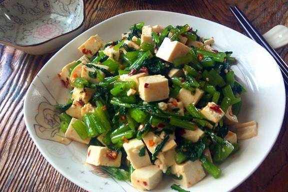 【豆腐拌茼蒿】主料:豆腐1块、茼蒿1把、辣椒油1汤匙、香油1/2汤匙、盐3克