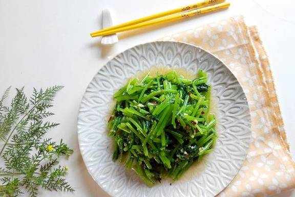 【凉拌茼蒿】材料:茼蒿250克、辣椒油1汤匙、香油1汤匙、盐适量、大蒜2瓣、白糖1茶匙