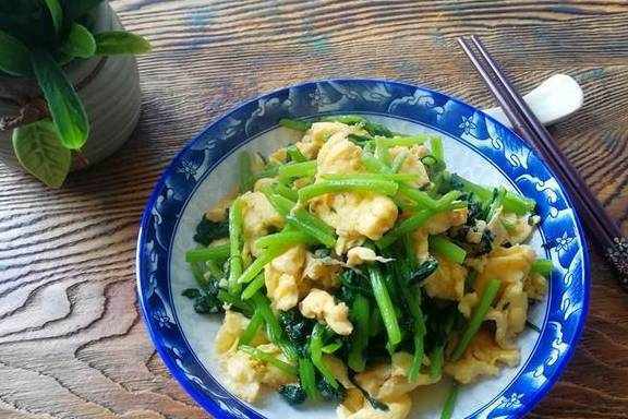 【鸡蛋炒茼蒿】材料:茼蒿300克、鸡蛋3个、油盐适量、大蒜3瓣