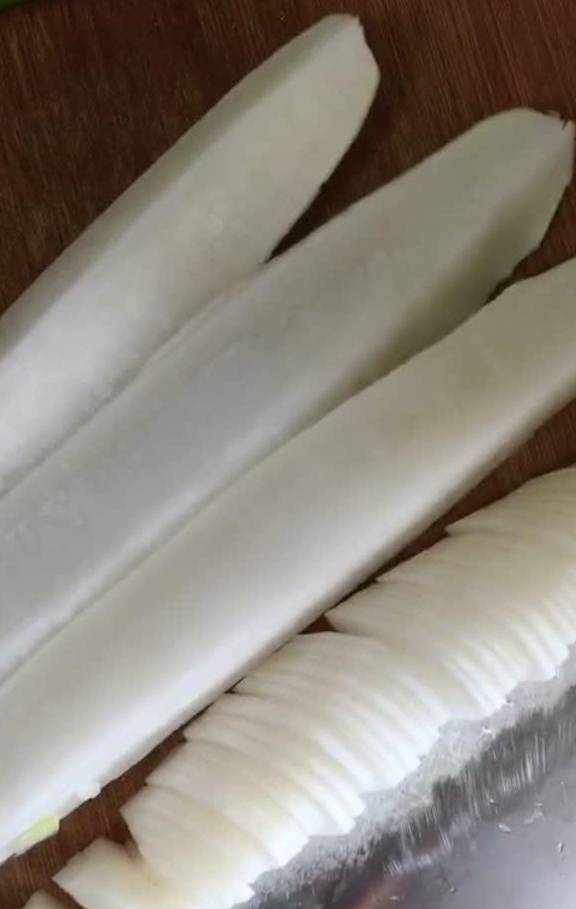 切成四半再切成片,对于厨房小白来说,常常纠结于怎么切的人来说,这是最简单明了的方法。