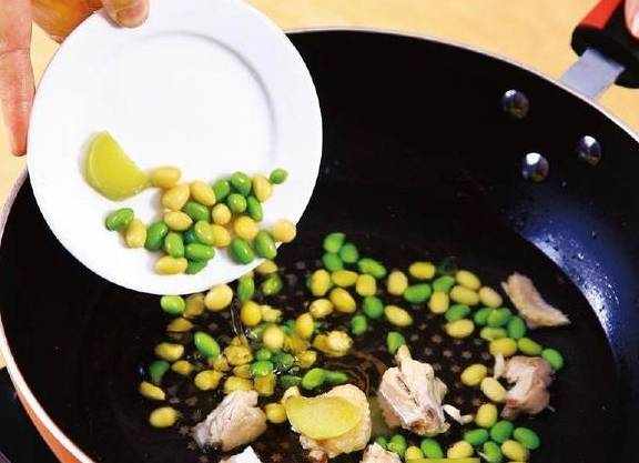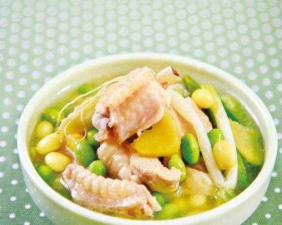 原料:鸡翅中300克,黄豆、青豆各25克,姜片5克,葱节5克