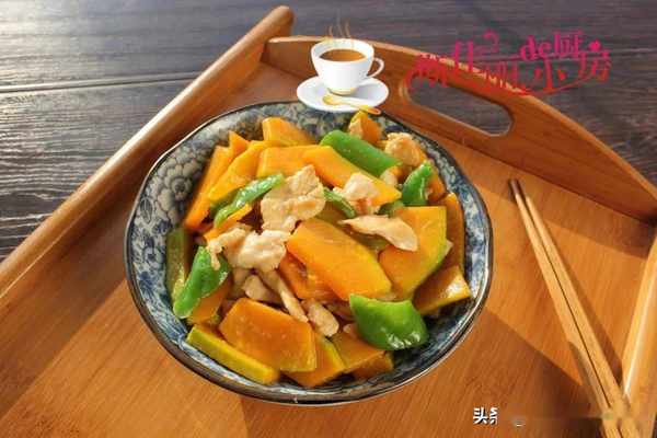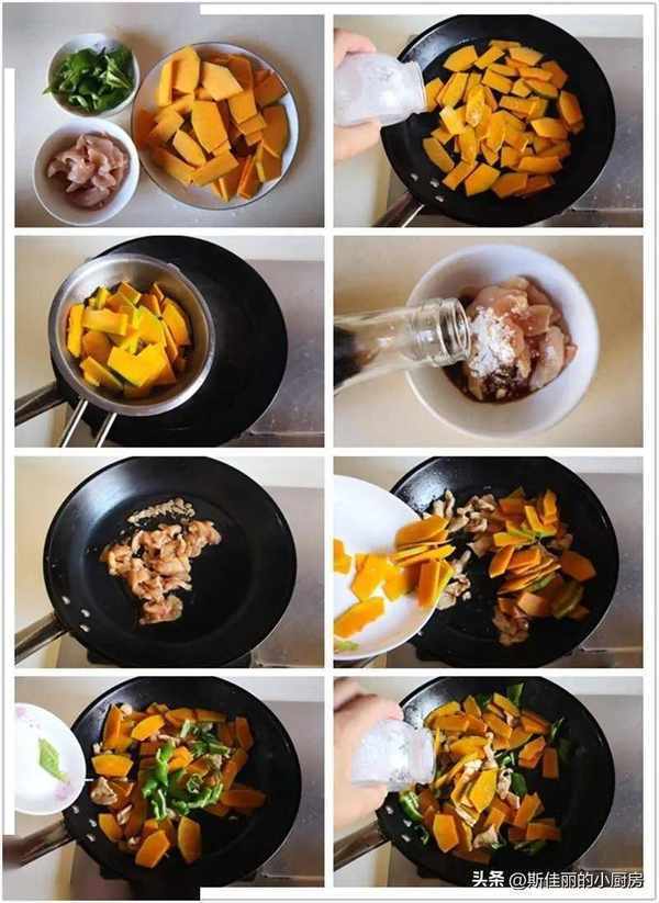 制作:1. 准备好食材; 2. 烧热水加入少许盐,将南瓜片放入锅中焯煮; 3 煮至八成熟捞出备用;4. 鸡脯肉片加入少许盐、生抽、料酒和淀粉等调味料拌均匀; 5. 热锅凉油,将鸡肉片翻炒至变色; 6. 加入南瓜片进锅翻炒; 7. 加入准备好的青椒进锅翻炒; 8. 再加入少许盐调味翻炒均匀即可。