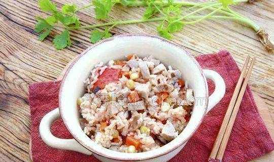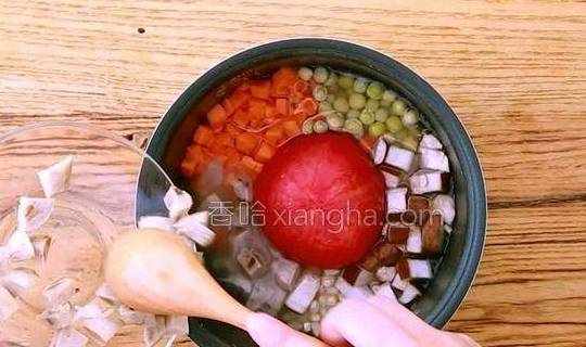 6.先将番茄放入大米中,再将其他材料一起放入锅中