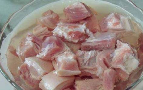 2.五花肉切麻将大小的块,冲洗干净后,放一汤匙料酒,浸泡一小时。捞出来沥干。