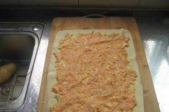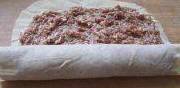 将肉馅平铺在豆皮上,上下两边留少许量以防肉馅溢出。