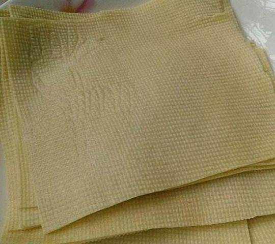 取豆皮一张铺在菜板上,将水分用餐巾纸吸干。