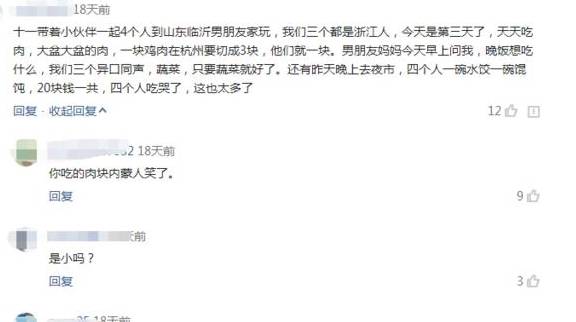 网友:十一带着小伙伴一起4个人到山东临沂男朋友家玩,我们三个都是浙江人,今天是第三天了,天天吃肉,大盆大盆的肉,一块鸡肉在杭州要切成3块,他们就一块。男朋友妈妈今天早上问我,晚饭想吃什么,我们三个异口同声,蔬菜,只要蔬菜就好了。还有昨天晚上去夜市,四个人一碗水饺一碗馄饨,20块钱一共,四个人吃哭了,这也太多了。