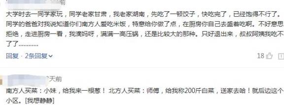 网友:南方人买菜:小妹,给我来一根葱!北方人买菜:师傅,给我称200斤白菜,送家去哈!就后边这个小区。