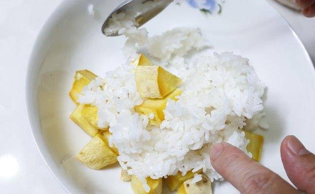将地瓜与白饭翻拌均匀,可依个人喜好将地瓜压成泥或维持块状。