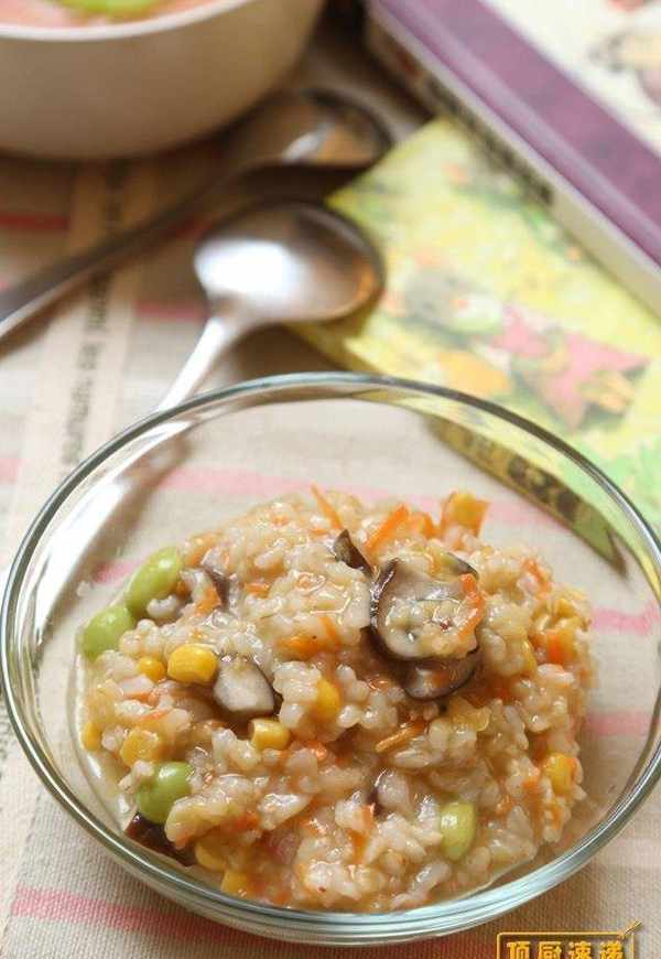 毛豆50g、红萝卜1/4支、玉米粒80g、新鲜香菇3朵、饭2碗、高汤适量