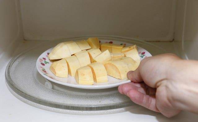 地瓜切块,放进微波炉中加热7分钟。