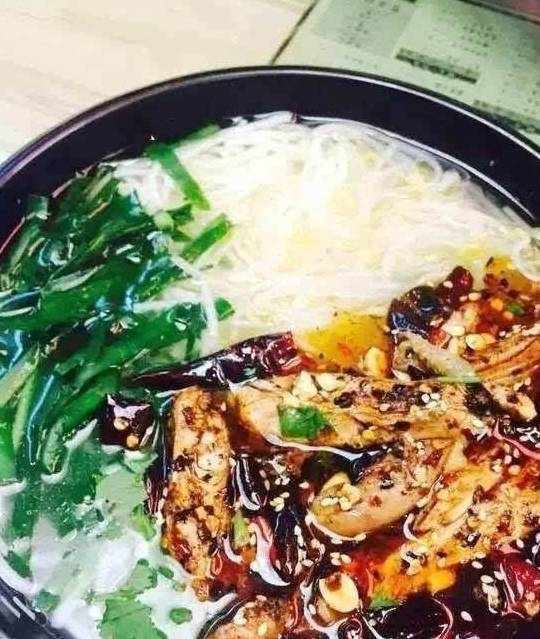 文山麻辣鸡米线:米线中放入麻辣鸡,鸡肉一般选用土鸡肉,鸡肉中还有胫骨,有嚼劲,米线香辣有味,在辣椒油中放入少许芝麻,让你回味无穷。