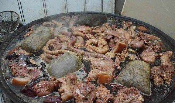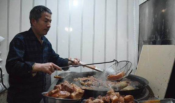 这口铁锅直径一米二,能卤肉两百斤,张秋丽和丈夫每天早上七点开始生火煮肉,中午11点准时出锅,一年三百六十五天,只在春节的时候休息几天,其余时间天天如此。