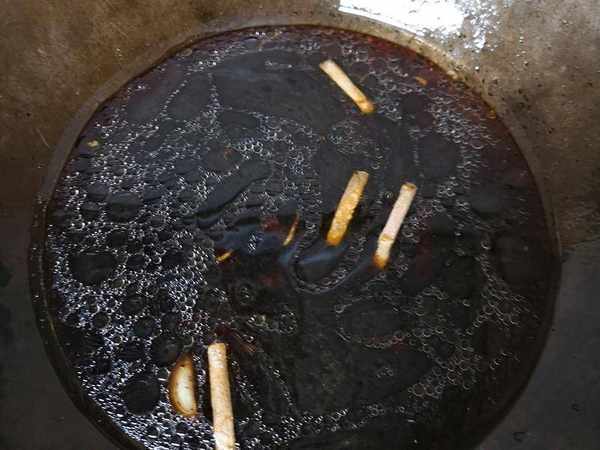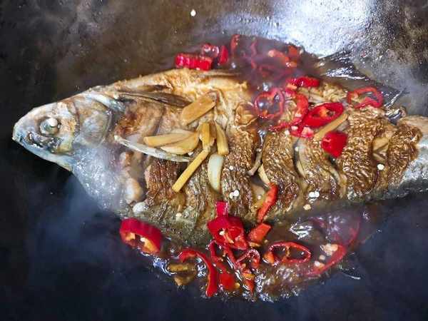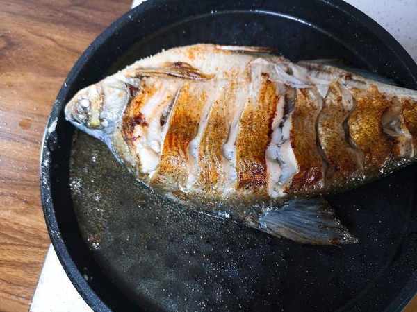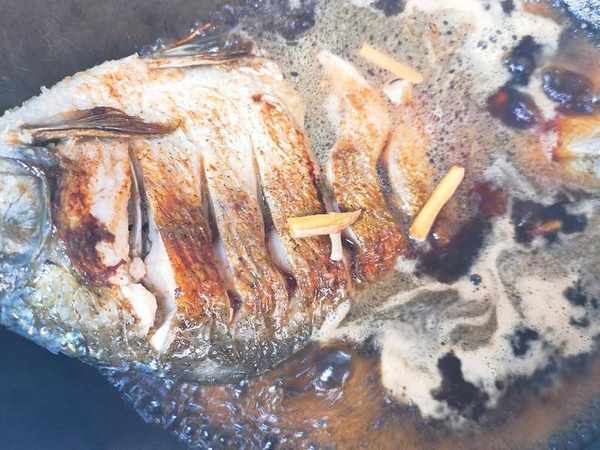 5、把鱼放进去锅里,稍微晃动一下锅,让鱼身都沾上料汁。