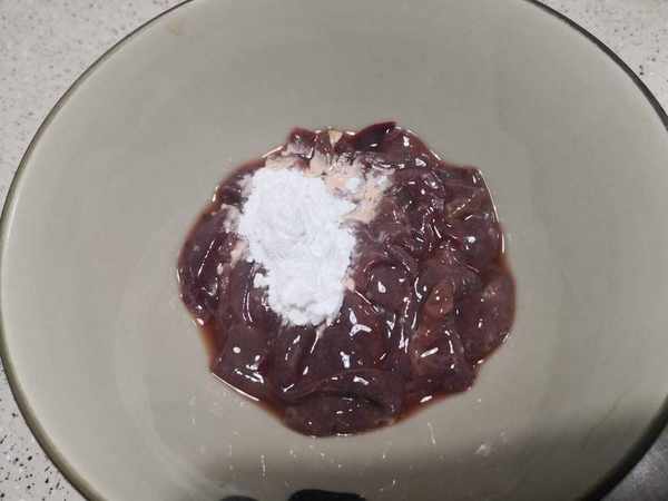 2、把猪肝放入碗里,加入盐,白胡椒粉,料酒,搅拌均匀,再放入干淀粉,搅拌均匀后腌制15分钟。