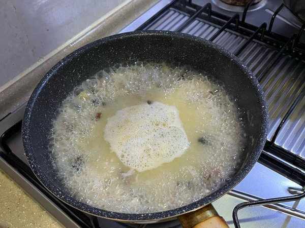 4、另起油锅,下入蒜片和姜片爆香,再倒入3勺酱油,大半勺生抽,半勺冰糖,1/4勺鸡精,1/4勺盐,半碗水,煮开。