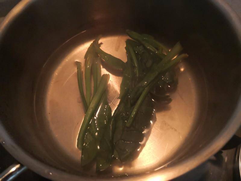 3、锅里烧开水,把菠菜放进去焯一下水,捞出,沥干水分。