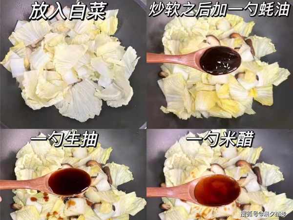 第四:将香菇片全部倒入锅中,香菇炒软,加入白菜,等白菜炒软,加一勺生抽,加少许蚝油,翻炒出几次。