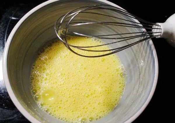 2、鸡蛋打破倒入容器中,加入盐、料酒、白胡椒粉,用筷子搅拌均匀备用,料酒可以去腥。