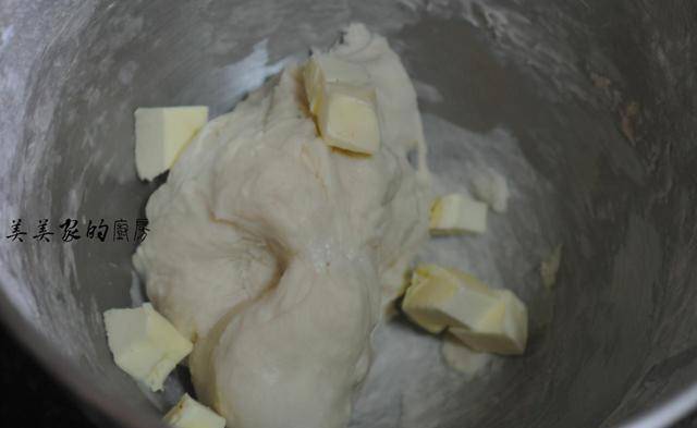 加入软化的黄油,2档揉至黄油吸收,大约一分钟就可以了,,然后转4档工作4-5分钟到完全扩展阶段。