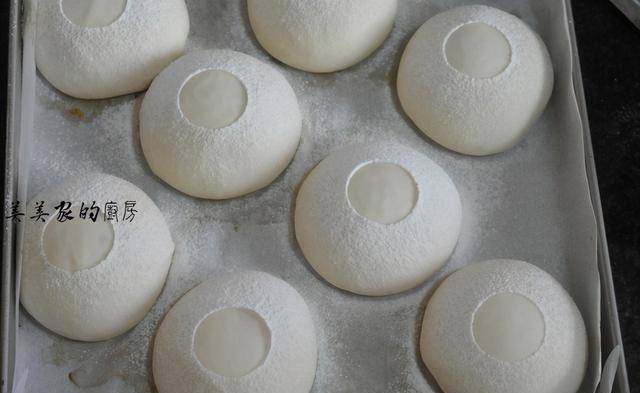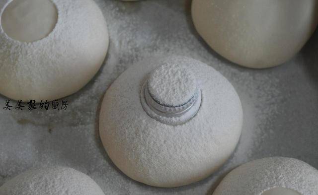 面团发酵好了,咱们可以来进行装饰啦,找一个小盖子盖住中间,筛上干粉。(我用的是啤酒瓶盖)