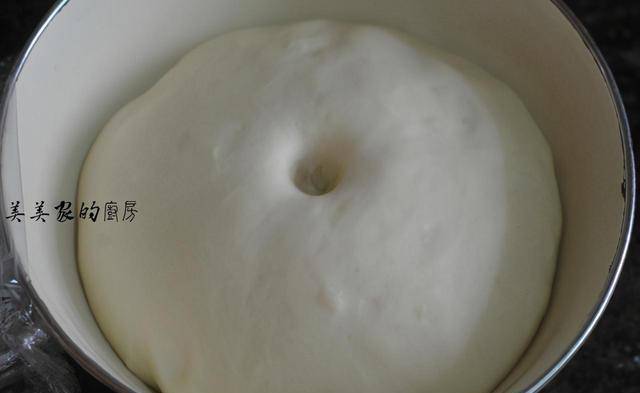 将揉好的面团放在温暖的地方,发至2-2.5倍大,用手指头戳一个洞,不回缩不塌陷就可以啦,冬天温度比较低,可以放在蒸锅里,将水烧至30度左右,增加湿度和温度,发酵更快。