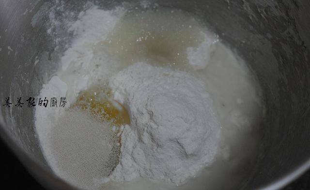 主料中所有的食材加入糖、酵母粉、盐,都倒入厨师机中,没有厨师机就自己手揉吧。
