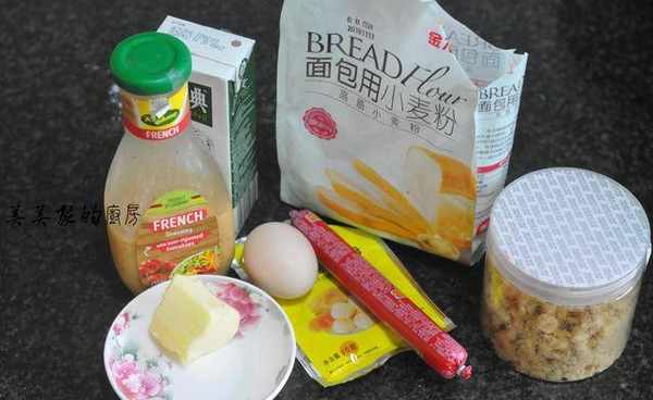 辅料糖40克盐2克酵母4克黄油30克南瓜子适量火腿一根肉松适量沙拉酱适量