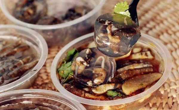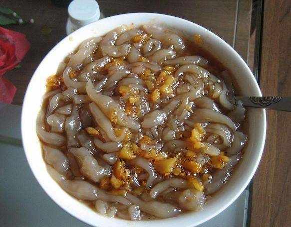 第一种:土笋冻。相信很多人看到中间有一个笋字就以为是笋子制作而成的,其实并不是这样。这里的土笋其实是一种蠕虫,形状就像是蚯蚓一样,又叫做涂笋。这种土笋主要生长在福建沿海地区,或者是江河的入海口等处,咸淡水的交汇处最多。制作方法就是将土笋洗净,然后放入锅中熬煮,将虫体内所含有的胶质物熬出来,然后等它冷却后凝固。这种土笋冻是福建泉州安海的一种传统小吃,据说味道很是鲜美,不过除了本地人喜爱吃之外,很多外地人都是不敢轻易尝试的。