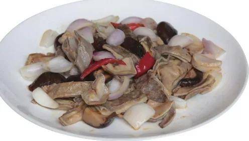 2炒勺中加色拉油,烧至七成热,投入肚片,炸至变色发挺,捞出控油。炒勺内留底油烧至五成热时,投入洋葱、香菇、酱油和适量清水,勾荧,倒入肚片、柑瓣,加入精盐、味精,翻炒均匀,淋香油,装盘即成。