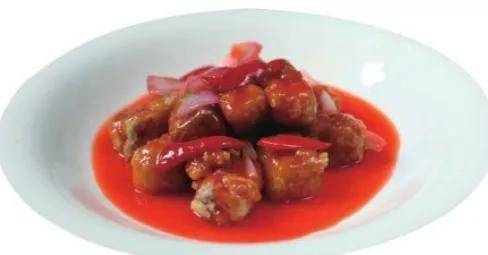 3炒勺内放清水少许,投入梅子酱、白醋、白砂糖、精盐、葱花、酱油、荸荠片,用水淀粉勾米汤芡,倒入裹肉,翻匀后放少许香油,装盘即成。