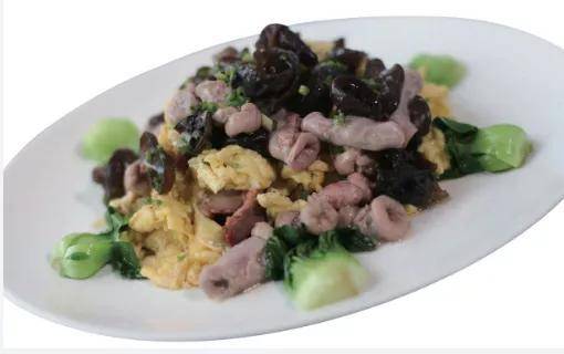 猪小肠(选厚实者)100克,鸡蛋10个,水发黑木耳10克,绿叶菜50克。