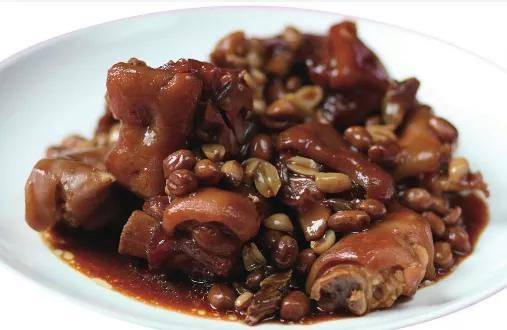 将猪蹄洗净,用温水浸泡30分钟,刮洗干净,剁成25克左右的块,入沸水锅氽透,清洗干净,放砂锅内。花生仁入开水烫透,捞出放猪蹄旁,加清汤、精盐、姜片、黄酒,烧开后撇去浮沫,加盖炖约1小时,捞去姜片,加味精即成。