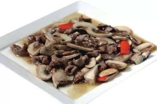 1猪肉切薄片。蘑菇去梗,焯水控干,斜切成片。葱头切薄片。