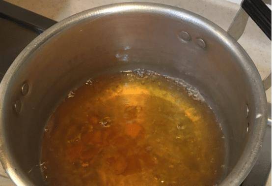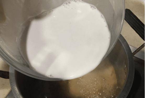 锅中加入100克的黄片糖,或者是白糖,煮到融化就可以了,这就是我们已经制作好的糖浆了,这些制作好的糖浆就可以加到刚刚搅拌均匀的马蹄粉水里面,这个搅拌过程必须慢慢操作,否则它会结块,注意一定是在稍微冷点的时候把糖浆迅速的加进马蹄粉水,混合搅拌就可以制作成为熟浆,马蹄粉不会被迅速烫熟,但是也会变一些颜色,看起来更加的粘稠,质地变得更加浓密,这就是搅拌好的马蹄粉浆,看起来有一点黄黄的感觉,像是一盘酸奶,像是在制作蛋糕的最后一个步骤的面粉浆。