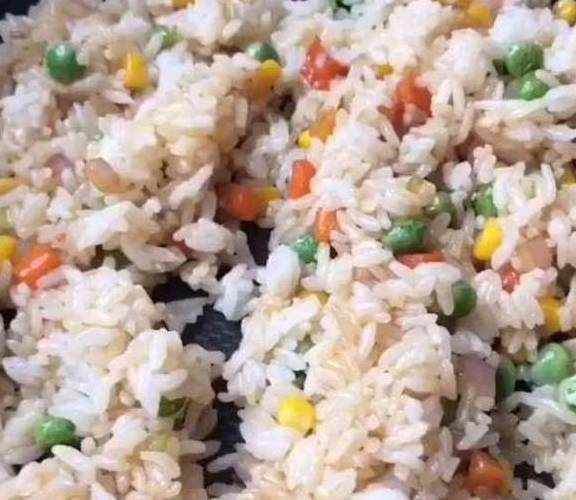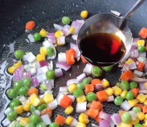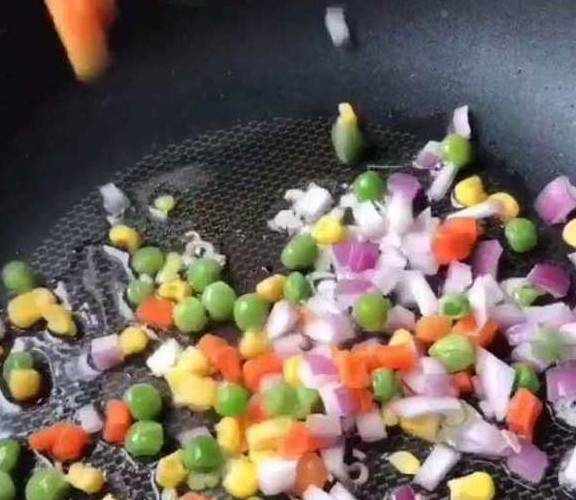 锅中加入油烧热,下入洋葱、碗豆粒、胡萝卜丁、玉米粒炒一下。