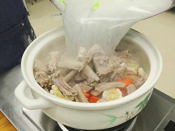 4.准备一口砂锅倒入胡萝卜玉米和马蹄,再倒入排骨和煮好的汤汁,再加入少许食盐,大火烧开以后盖上锅盖转中火炖煮40分钟,最后加入味精、鸡粉、胡椒粉煮开,关火美味即成。