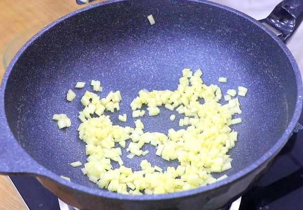 3.把另一个苹果也切成小粒,用来做馅心,切好之后把锅烧热,倒入苹果粒,翻炒1分钟左右,苹果变软以后淋入少许水淀粉,增加苹果粒的粘性,翻匀后即可盛出备用。
