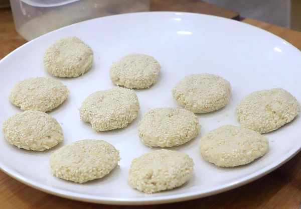 4.在苹果面中撒入少许干面粉,取出适量的面团把它摁扁,放入一勺苹果馅,在虎口处边转动边收紧开口,馅料包严以后,放入芝麻盒中,让其表面均匀裹上白芝麻,放在手心处压扁,苹果饼的生坯就做好了。