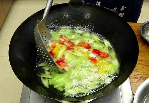 4.锅中加入清油,放入葱姜爆香,把食材控干水分以后倒入锅中,大火快速爆炒10秒钟,高温能使析出的水分快速地蒸发,淋入碗料快速地翻匀就可以出锅了,美味即成。