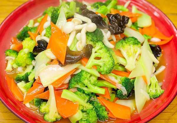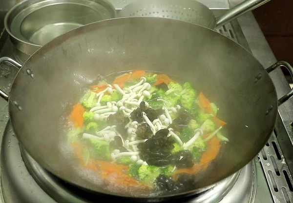 2.起锅烧水,加入食用油、食盐,水开下入胡萝卜、西兰花、白玉菇、木耳烫1分钟倒出过凉控水备用。