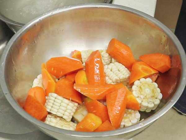 1.适量的马蹄去皮清洗干净;几根胡萝卜切成大一点的滚刀块;两根玉米切成块放在一起备用;排骨剔开后剁成小块。