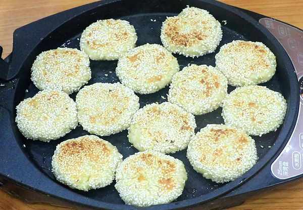 6.把饼翻一下面,这时饼的底面已经烙成金黄色,翻过来之后再烙3分钟,饼两面都呈金黄色时即可出锅,美味即成。