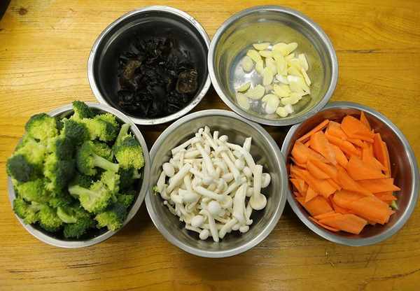 1.准备一盒白玉菇去掉根部打散;一颗西兰花切成小块;一根胡萝卜去皮切成片;一把泡开的黑木耳切成小块;一段葱白切成葱花;一块生姜切成姜片。