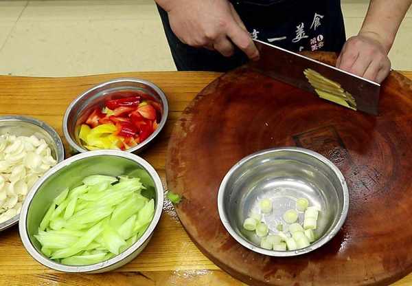 1.准备适量的鲜百合,切去两头把它拍散,把泥沙全部洗干净,最好浸泡一会儿。把芹菜表面的粗纤维刮掉,以免吃的时候塞牙, 把比较大的破开斜切成小段,再切一些彩椒片用来配色。
